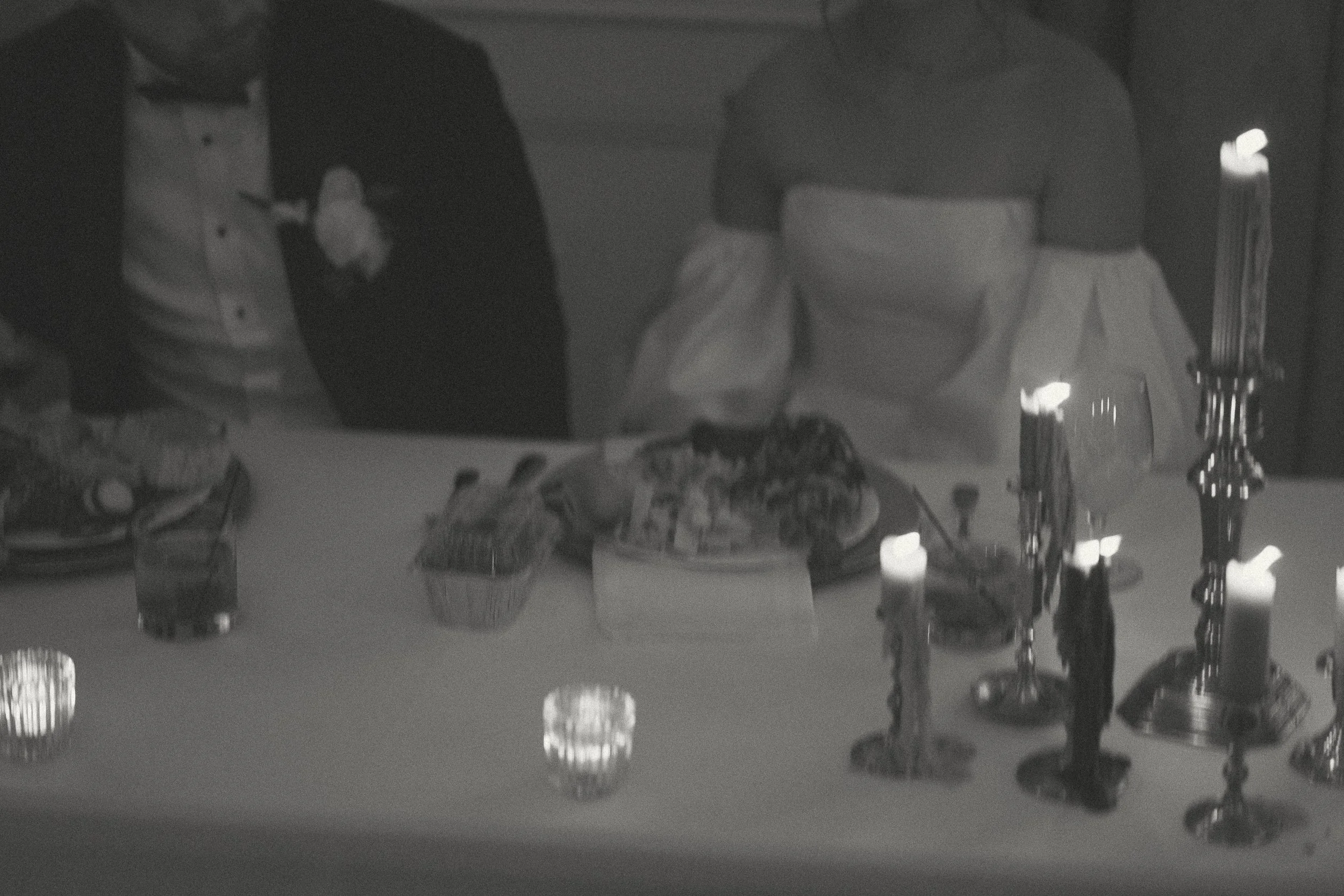 Intentional motion blurred photo of the head table romantically lit by candles of various sizes.