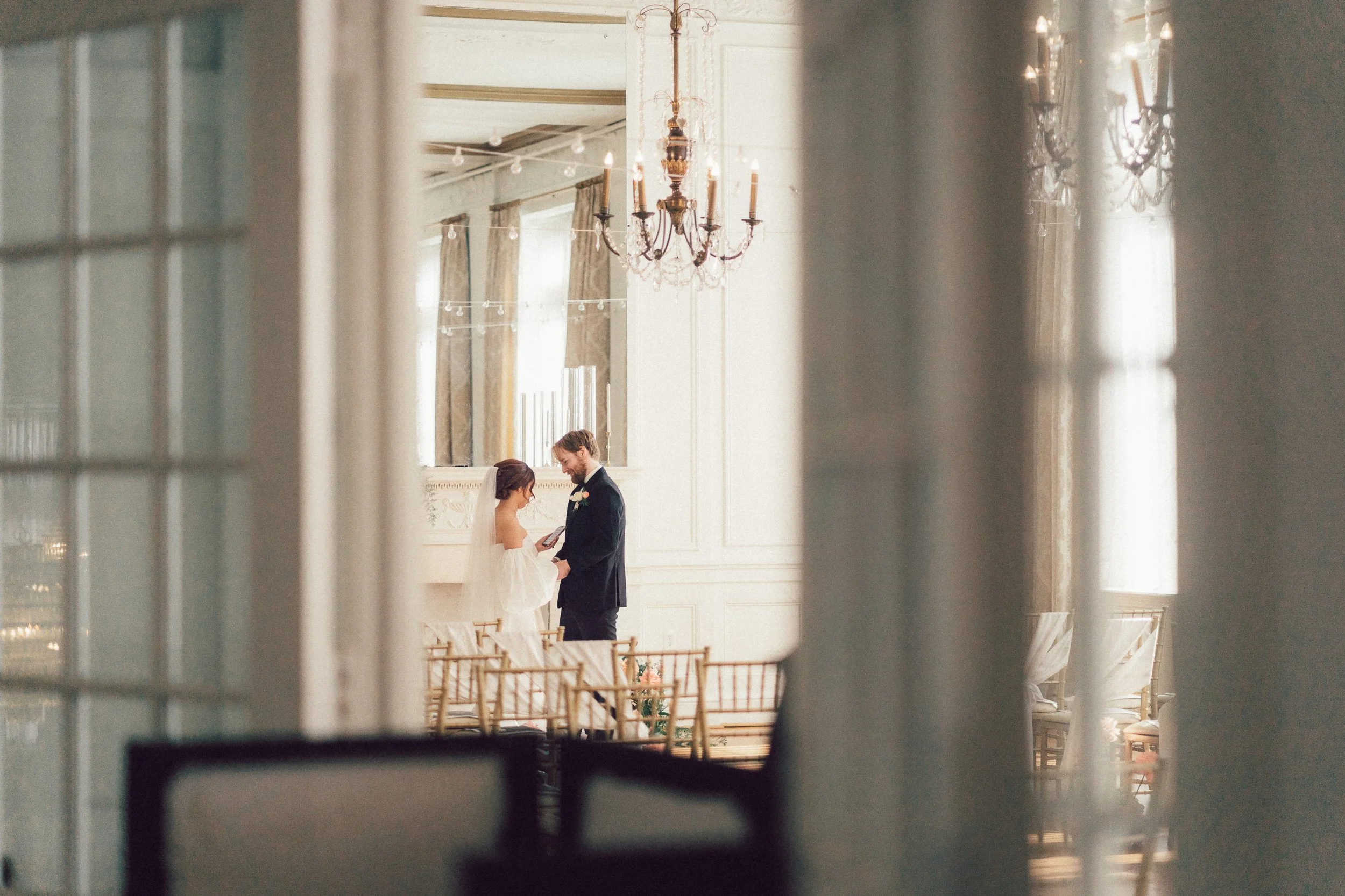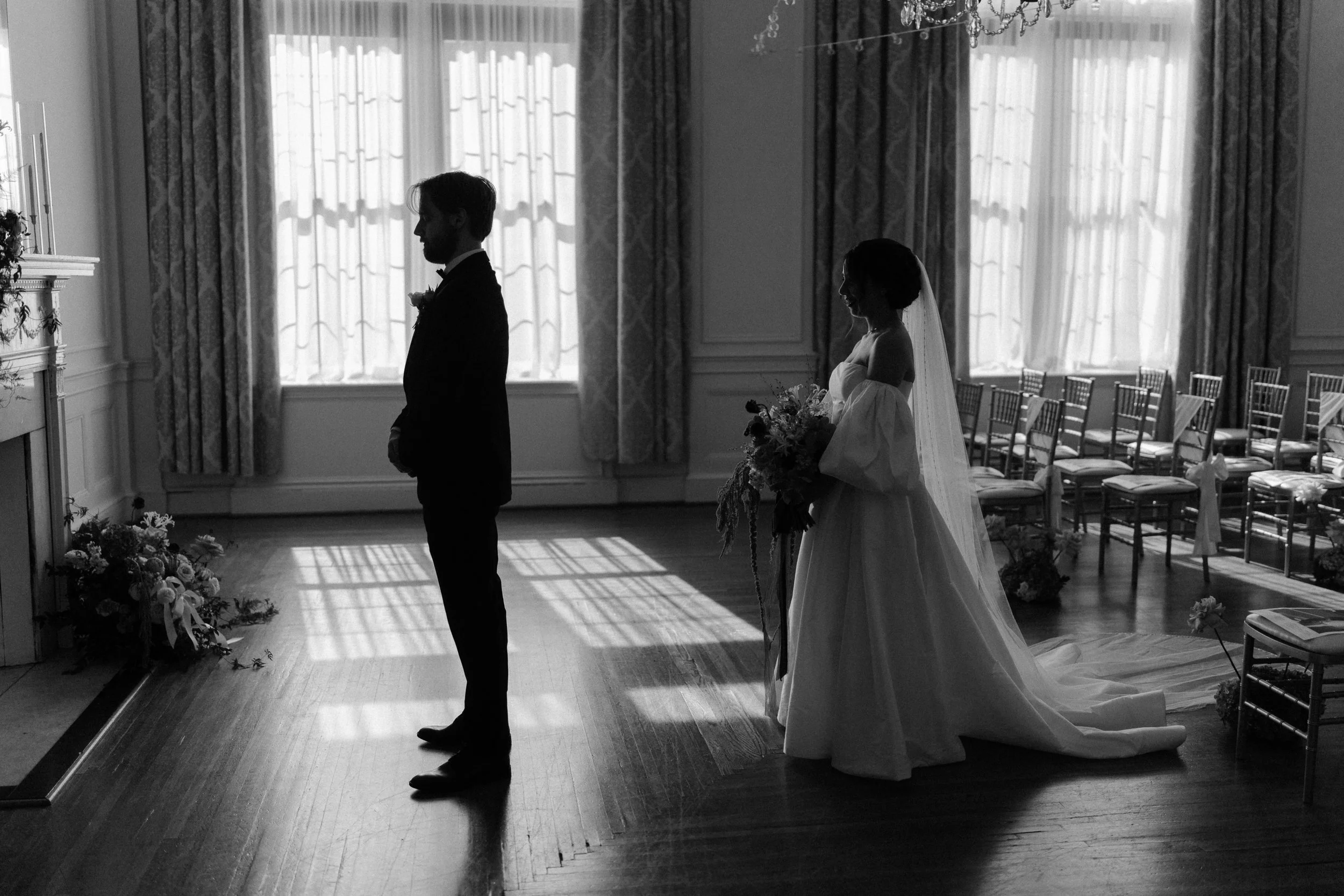 Documentary style photograph of the moment just before an emotional first look at Hotel Concord in Charlotte, North Carolina.